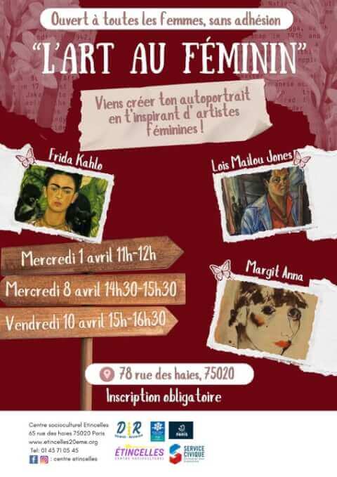 Nous vous invitons à un atelier créatif dédié aux artistes féminines 💜 Venez réaliser votre autoportrait en vous inspirant d’artistes comme Frida Kahlo, Lois Mailou Jones ou Margit Anna. Un moment d’expression, de découverte et de valorisation des femmes dans l’art 🌸 📅 Plusieurs dates : • Mercredi 1er avril (11h–12h) lors du moulin à café • Mercredi 8 avril (14h30–15h30) • Vendredi 10 avril (15h–16h30) 📍 78 rue des Haies, Paris 20e Ouvert à toutes les femmes ! Gratuit, inscription obligatoire.