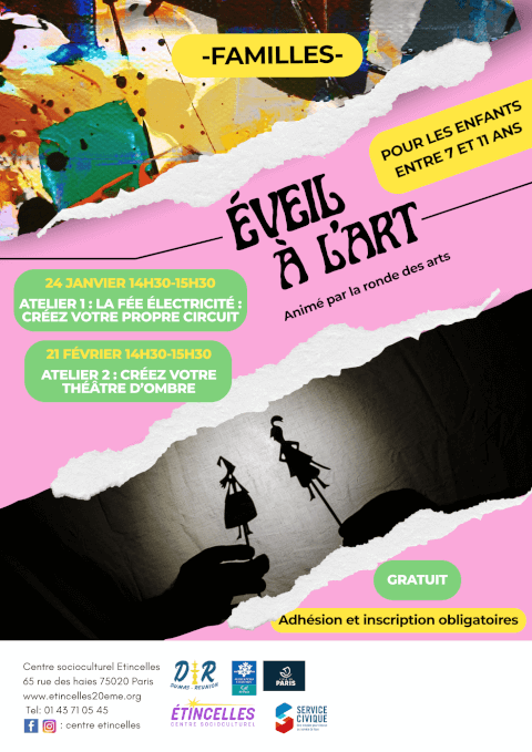 Partagez un moment créatif et ludique avec vos enfants lors du cycle « Éveil à l’art », animé par la Ronde des Arts 🎨 Des ateliers pour les enfants de 7 à 11 ans, mêlant création, imagination et découverte artistique. 🗓️ Atelier 1 : 24 janvier (14h30–15h30) ⚡ La fée électricité : créez votre propre circuit 🗓️ Atelier 2 : 21 février (14h30–15h30) 🎭 Créez votre théâtre d’ombres 📍 78 rue des Haies, Paris 20e Gratuit Adhésion et inscription obligatoires