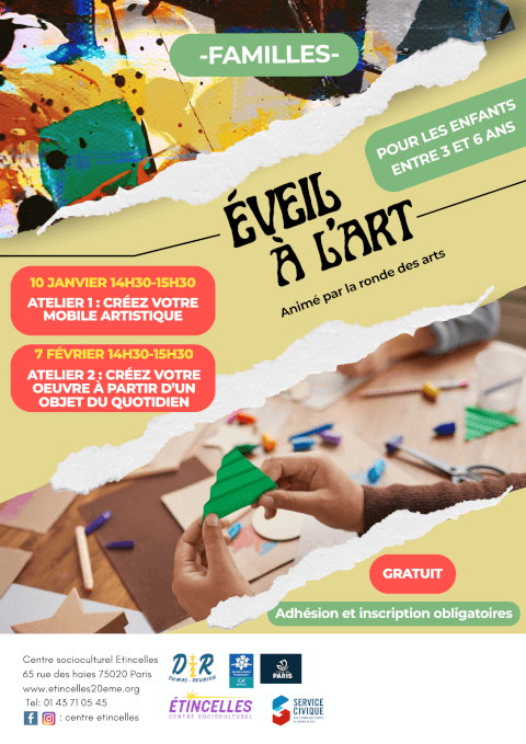 Partagez un moment créatif avec vos enfants lors du cycle « Éveil à l’art », animé par la Ronde des Arts. Des ateliers ludiques et artistiques pour les enfants de 3 à 6 ans, à vivre en famille. Atelier 1 – 10 janvier (14h30–15h30) 🎨 Créez votre mobile artistique Atelier 2 – 7 février (14h30–15h30) 🖌️ Créez votre œuvre à partir d’un objet du quotidien 📍 78 rue des Haies, Paris 20e Gratuit Adhésion et inscription obligatoires