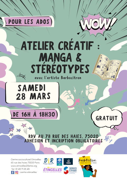 Atelier créatif pour les ados : Manga & stéréotypes ! 🎨 Le Centre Étincelles vous propose de participer à un atelier créatif autour du manga avec l’artiste BarbOcitron. Un moment pour dessiner, échanger et réfléchir aux stéréotypes à travers l’univers du manga ✏️📖 📅 Samedi 28 mars de 16h à 18h30 📍 78 rue des Haies, Paris 20e Gratuit, adhésion et inscription obligatoires