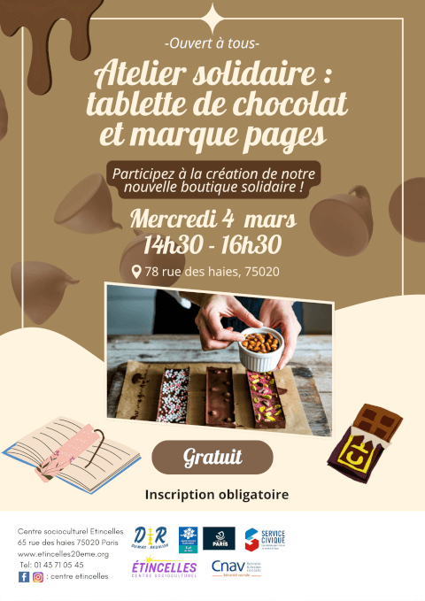 Atelier solidaire : tablette de chocolat 🍫 & marque-pages Venez partager un moment convivial et créatif en participant à la création de notre nouvelle boutique solidaire ! Au programme : réalisation de tablettes de chocolat gourmandes et de jolis marque-pages faits main. 🗓 Mercredi 4 mars de 14h30 à 16h30 📍 78 rue des Haies, Paris 20e Gratuit, inscription obligatoire.