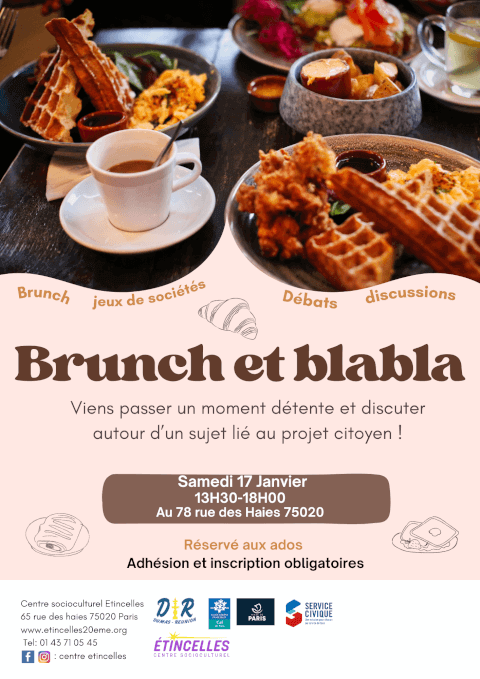 Envie de passer un moment chill entre ados ? On vous propose un brunch convivial, des jeux de société, des discussions et débats autour d’un sujet lié au projet citoyen, le tout dans une ambiance détendue et bienveillante 😊 📅 Samedi 17 janvier de 13h30 à 18h 📍 Au 78 rue des Haies, 75020 Paris Gratuit, avec adhésion et inscription obligatoires.