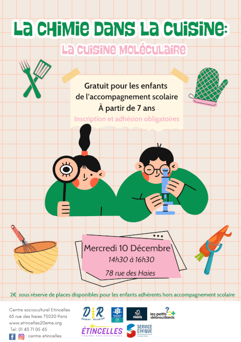 < 7-11 ans> Le Centre Étincelles vous propose un atelier amusant et scientifique : “La chimie dans la cuisine ” ! Une activité ludique pour découvrir la science… en cuisinant ! 👩🍳🧪 📅 : Mercredi 10 Décembre de 14h30 à 16h30 au 78 rue des Haies, 75020 Paris Gratuit pour les enfants de l’accompagnement scolaire, et 2€ pour les enfants adhérents hors accompagnement scolaire (sous réserve de places disponibles). Inscription et adhésion obligatoires.