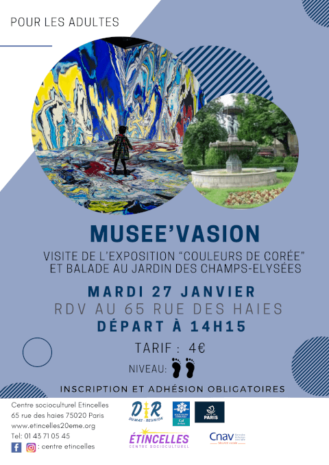 Visitez l’exposition « Couleurs de Corée », puis profitez d’une balade au jardin des Champs-Élysées lors d’une sortie culturelle conviviale 🏛️🌸 📅 Mardi 27 janvier 🕒 Départ à 14h15 au 65 rue des Haies, Paris 20e Tarif : 4 € Inscription et adhésion obligatoires