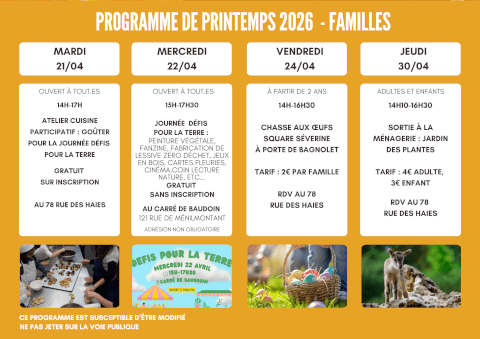 Le Centre Étincelles sort son programme des vacances de printemps 🌸✨ Des activités pour les adultes, les familles, les enfants et les ados. Inscriptions : • Adultes : à partir du mardi 7 avril dès 14h • Familles, enfants et ados : mercredi 8 avril de 17h à 19h 📍 Les inscriptions se font à l’accueil du Centre Étincelles au 65 rue des Haies, Paris 20e. Inscription et adhésion préalable obligatoires.