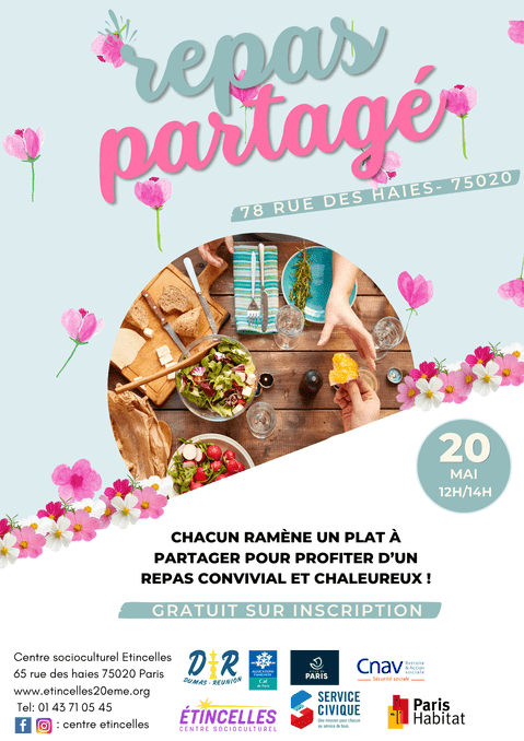 Envie d’un moment convivial et chaleureux ? Rejoignez-nous pour un repas partagé placé sous le signe des fleurs et de la bonne humeur ! Chacun ramène un plat à partager 🥗 Ambiance printanière et décor fleuri au rendez-vous ! 🌼 📅 Mercredi 20 mai 🕛 12h – 14h 📍 78 rue des Haies, 75020 Paris Gratuit sur inscription