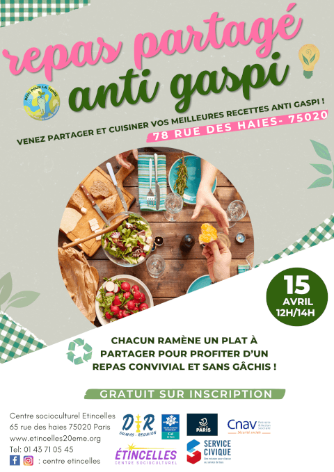 Repas partagé anti-gaspi 🍽️♻️ On vous propose un moment convivial autour de la cuisine anti-gaspillage ! Un atelier cuisine anti-gaspillage suivi d’un déjeuner chaleureux où chacun ramène un plat à partager 🌿 On vous attend nombreux pour ce moment de partage 💚 📅 Mercredi 15 avril de 12h à 14h 📍 78 rue des Haies • Gratuit sur inscription