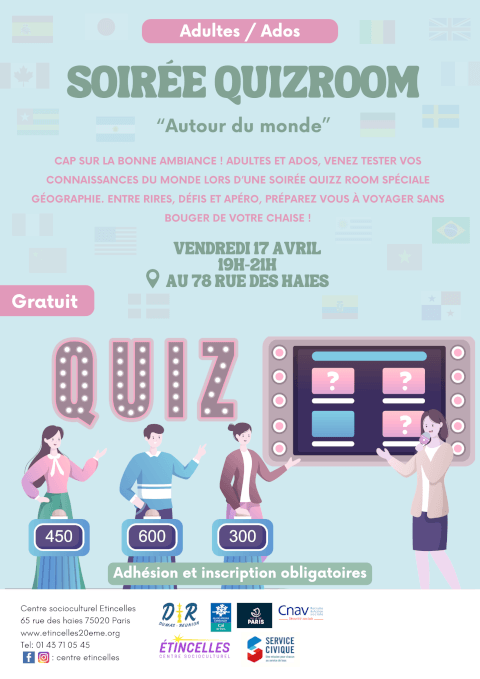 SOIRÉE QUIZ ROOM : “AUTOUR DU MONDE” 🧠🌍 Prêts à tester vos connaissances dans une ambiance conviviale ? 😄 Rejoignez-nous pour une soirée quiz spéciale géographie, entre défis, rires et bonne humeur ! Voyagez aux quatre coins du monde sans bouger de votre chaise et relevez les défis en équipe. 📅 Vendredi 17 avril de 19h à 21h 📍 78 rue des Haies, Paris 20e •Gratuit, adhésion et inscription obligatoires
