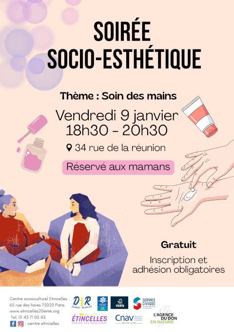 Participez à une soirée socio-esthétique dédiée au soin des mains 💅 Un moment de détente, de bien-être et d’échange entre mamans, dans une ambiance conviviale. 📅 Vendredi 9 janvier de 18h30 à 20h30 📍 34 rue de la Réunion, Paris 20e Gratuit Inscription et adhésion obligatoires ⚠️ Réservé aux mamans uniquement