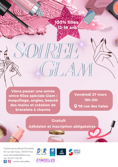 Soirée Glam 100% filles !💄 Les adolescentes de 12 à 18 ans sont invitées à une soirée entre filles autour de la beauté et de la créativité ✨ Au programme : maquillage, ongles, beauté des mains et création de bracelets à charms dans une ambiance conviviale et fun. Une belle occasion de se retrouver, échanger et partager un moment entre filles 💕 📅 Vendredi 27 mars de 19h à 21h 📍 78 rue des Haies, Paris 20e Gratuit, adhésion et inscription obligatoires