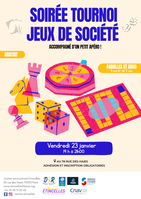 Soirée tournoi jeux de société 🎲 Venez partager un moment ludique en famille ou entre ados lors d’une soirée jeux, accompagnée d’un petit apéro 🍹 Stratégie, hasard et bonne humeur seront au rendez-vous ! 📅 Vendredi 23 janvier de 19h à 21h 📍 78 rue des Haies, Paris 20e • À partir de 5 ans ⚠️ • Gratuit • Adhésion et inscription obligatoires