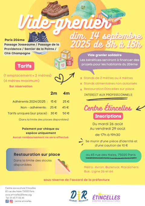Vide grenier du quartier Réunion : Passage sentier de la pointe, Josseaume, Providence et Cité Champagne. Inscription du mardi 26 août au vendredi 5 septembre de 17h à 19h30 (hors week-end) au 65 rue des Haies 75020.